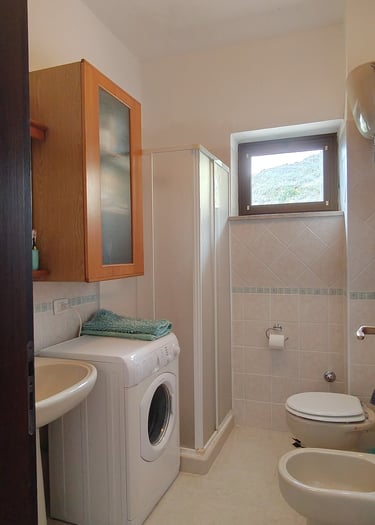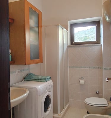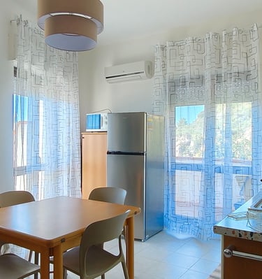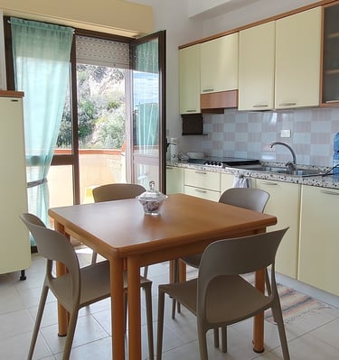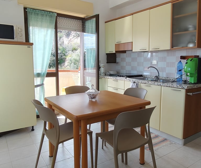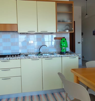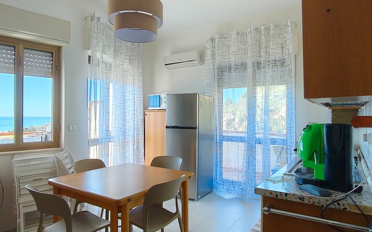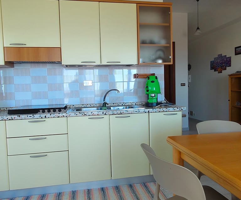 On aperçoit un réfrigérateur, un plan de travail, et une machine à café, parfait pour les matins face à la mer.