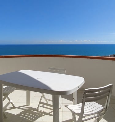 Les grandes baies vitrées encadrent un panorama marin paisible, qui donne à la pièce une atmosphère de vacances et de sérénité.